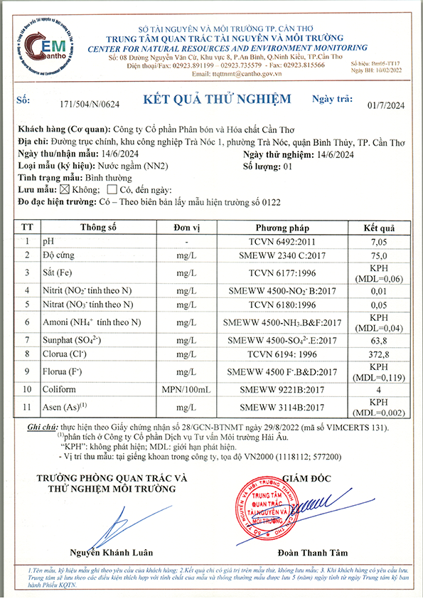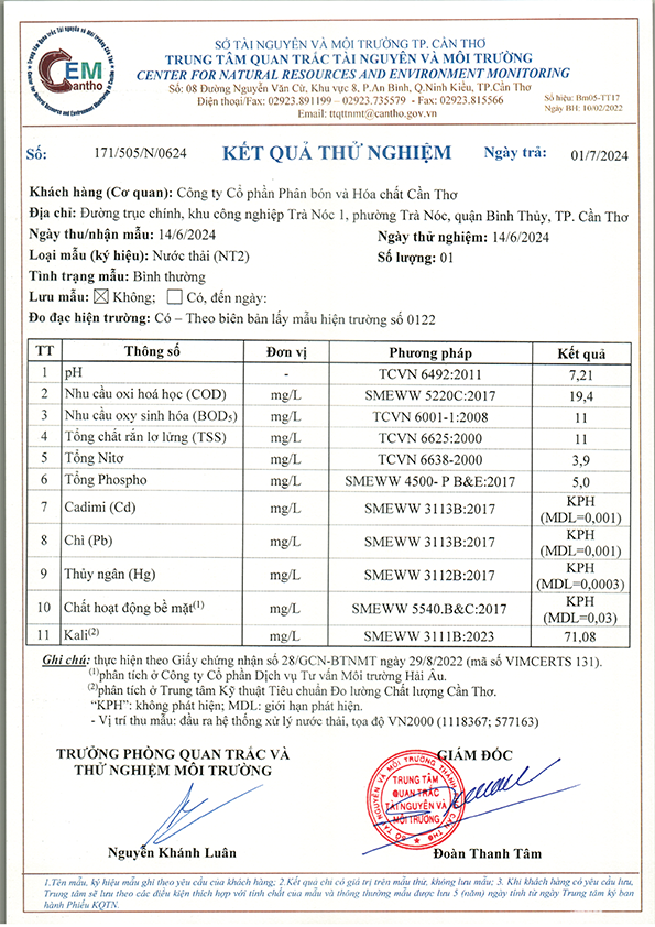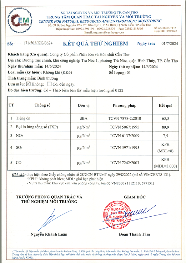 Dưới đây là kết quả một số hạng mục quan trắc môi trường của Công ty cổ phần Phân bón và Hoá Chất Cần Thơ